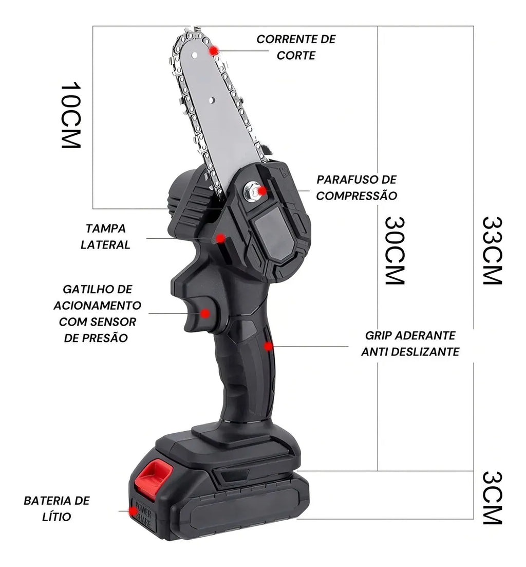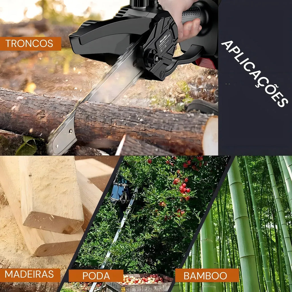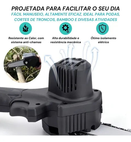 Projetada para ser usada com apenas uma mão, a mini motosserra oferece excelente ergonomia e controle, tornando a poda de galhos, arbustos e pequenas árvores mais ágil e segura, mesmo para usuários iniciantes.
